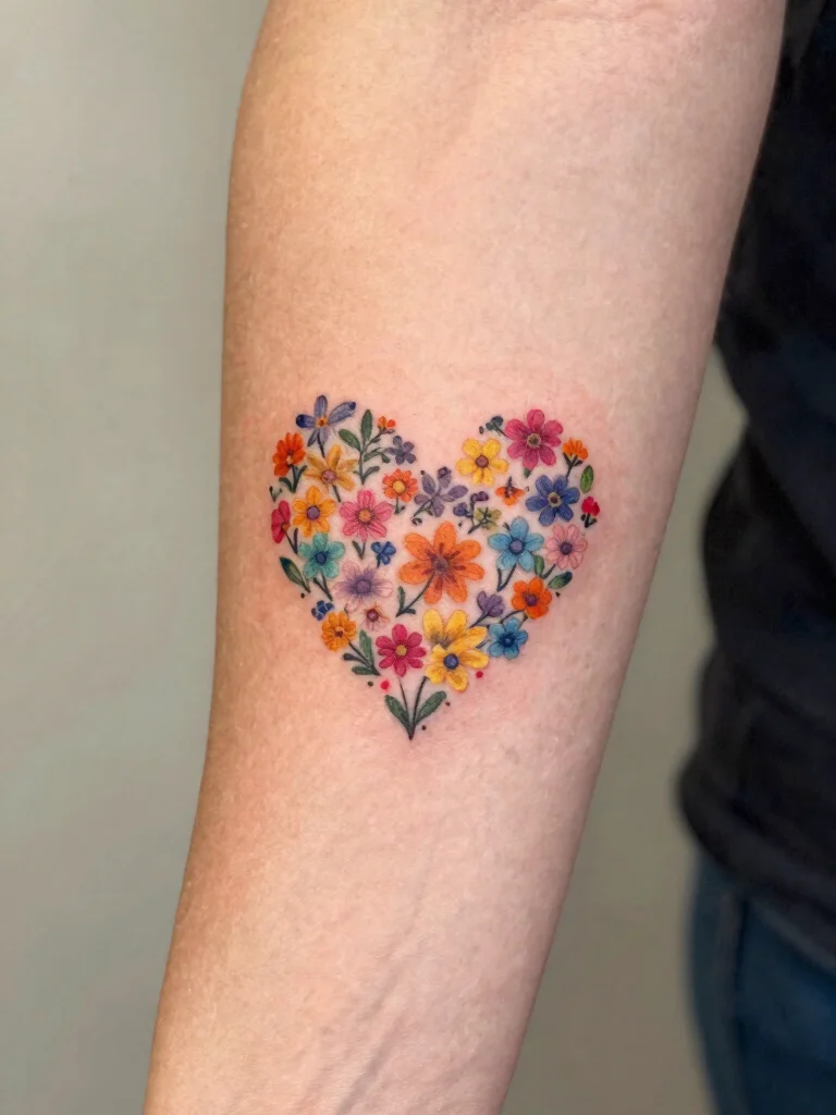 The floral heart tattoo combines love and nature into an enchanting design. This tattoo represents the connection between your heart and the beauty of the earth, making it an ideal choice for romantics. Tiny floral hearts can feature various flowers surrounding the heart shape, showcasing your favorite blooms.