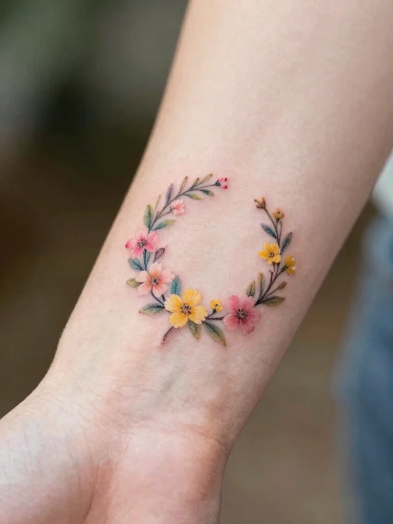 A whimsical floral wreath tattoo beautifully represents unity and a connection to nature. This design showcases various flowers arranged in a lovely circle, symbolizing eternity and the cycles of life.