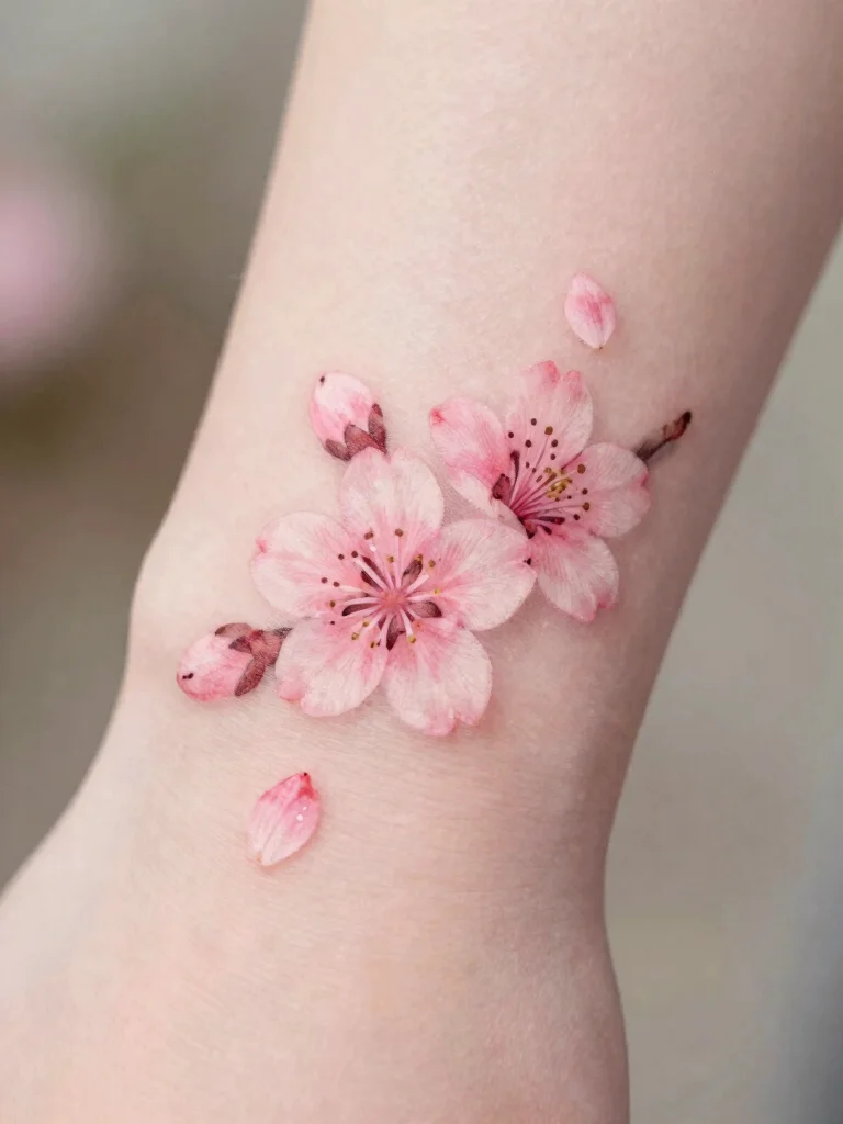 A tiny cherry blossom tattoo allows you to carry a reminder of life’s beauty and its ephemeral nature.