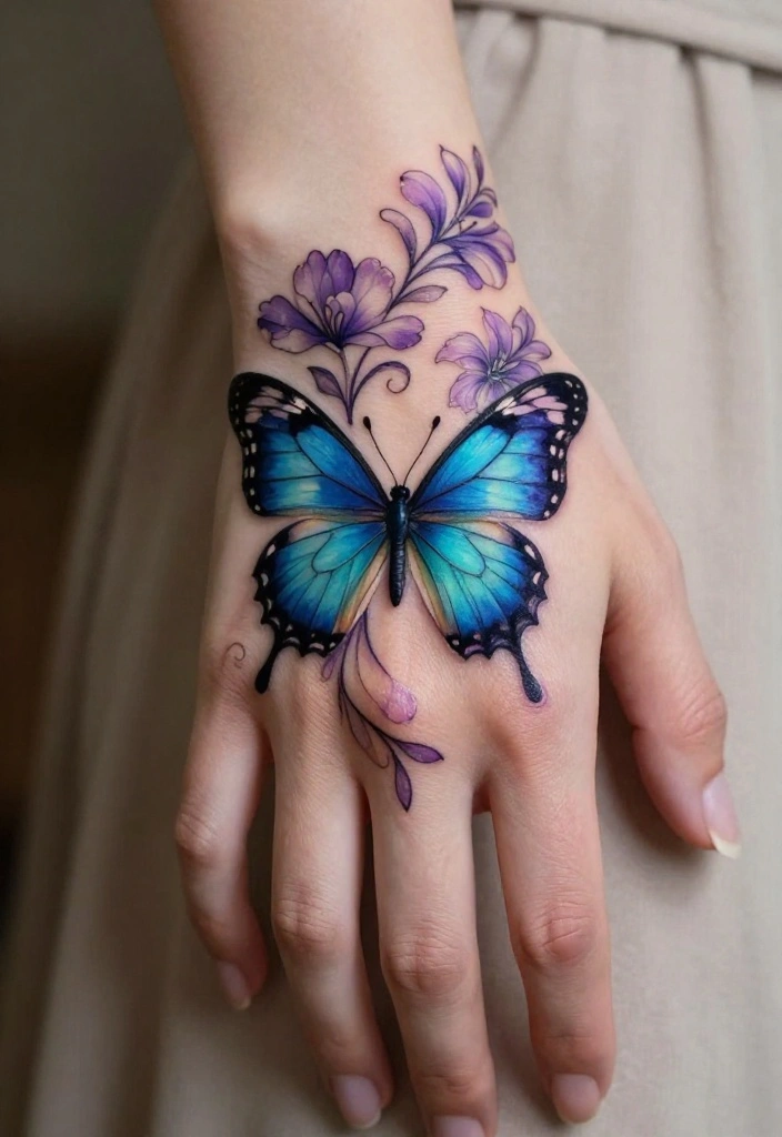 Butterflies symbolize transformation and beauty, making them a favored choice among women for hand tattoos. These vibrant designs often represent personal growth and change, perfect for those who have overcome challenges. The graceful wing patterns and colors create a delicate, feminine tattoo that can be beautifully styled on your hand.