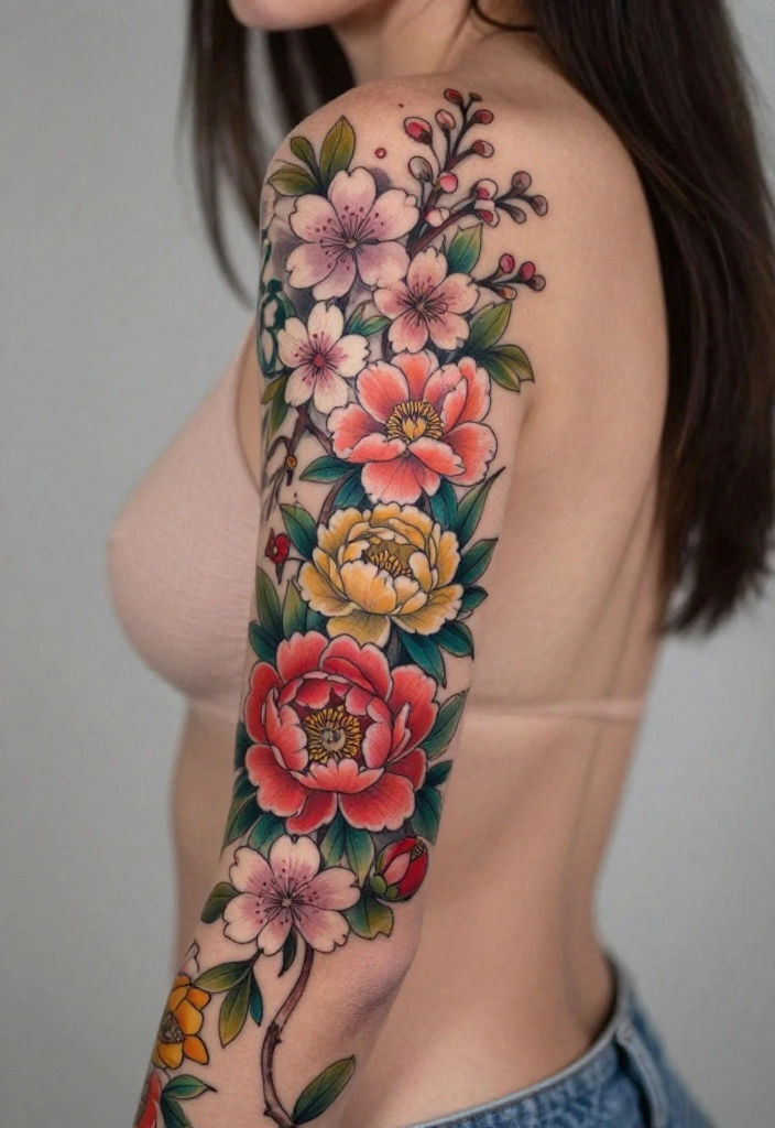 A floral sleeve tattoo can tell your unique story, showcasing individual beauty and strength through interconnected art.