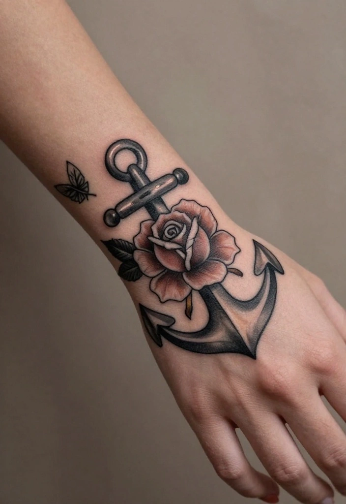 Vintage-style tattoos draw inspiration from classic designs, often incorporating elements like old-school roses or anchors. Women may gravitate toward these timeless designs for their nostalgic charm and elegance. These tattoos can be done in traditional black and gray or muted colors, beautifully gracing the hand.