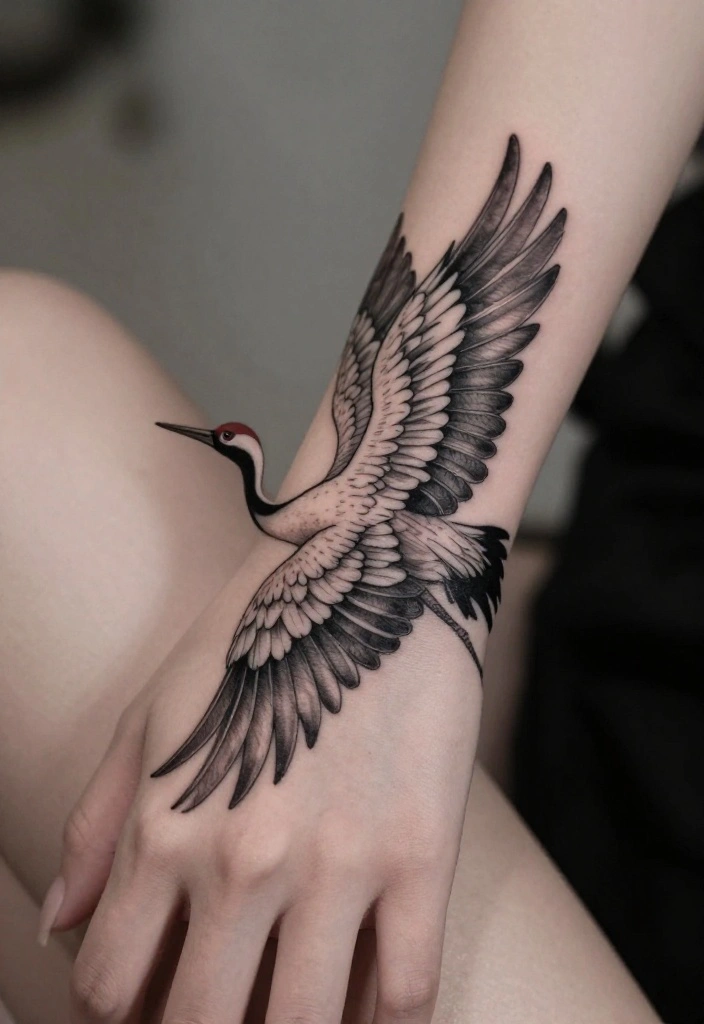 Fun fact: In Japanese folklore, cranes symbolize longevity for over 1,000 years. For japanese hand tattoos, women choose crane designs to mark a long, joyful life—captured in graceful lines.