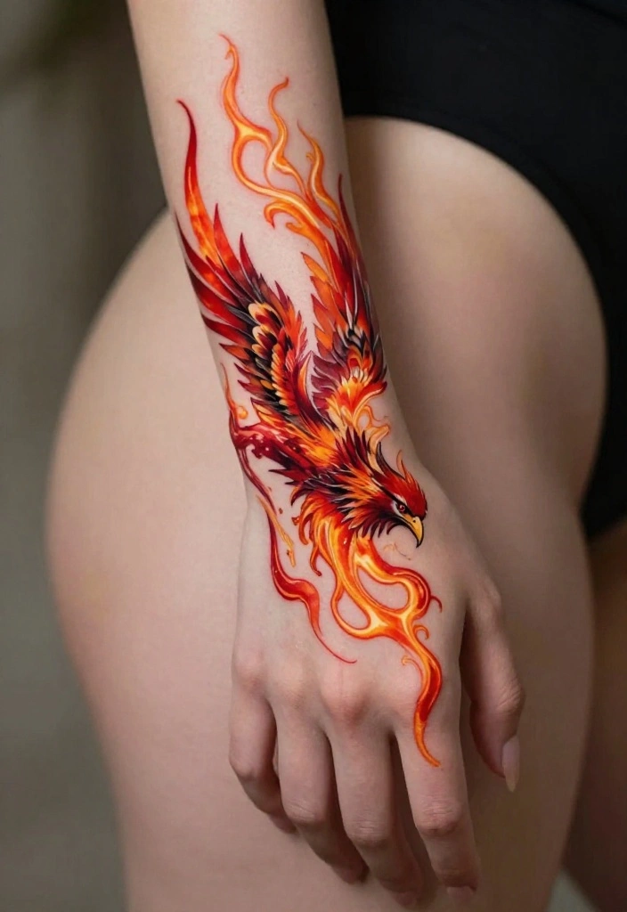 Falcons symbolize focus and ambition, often chosen by women to represent their aspirations and determination. These tattoos can depict a falcon in elegant flight, capturing its grace and agility. The detailed feathers and sharp features create a stunning visual impact on the hand, often accompanied by elements like clouds or rays of sunlight.