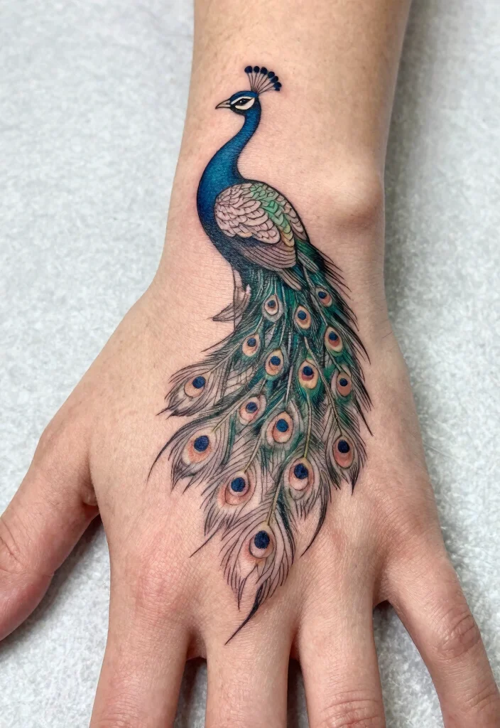 Peacocks symbolize beauty and elegance. A small, minimalist peacock on your hand can add a touch of exotic style. These tattoos are often crafted with simple lines and shapes that capture the majestic stance of the peacock. A peacock tattoo can be a fantastic way to express your individuality and sense of style. It’s both eye-catching and subtle, perfect for a minimalist look.