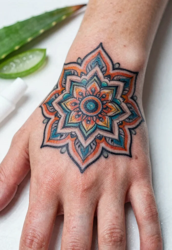 What aftercare steps help maintain the vibrancy of a mandala hand tattoo and preserve symmetry?