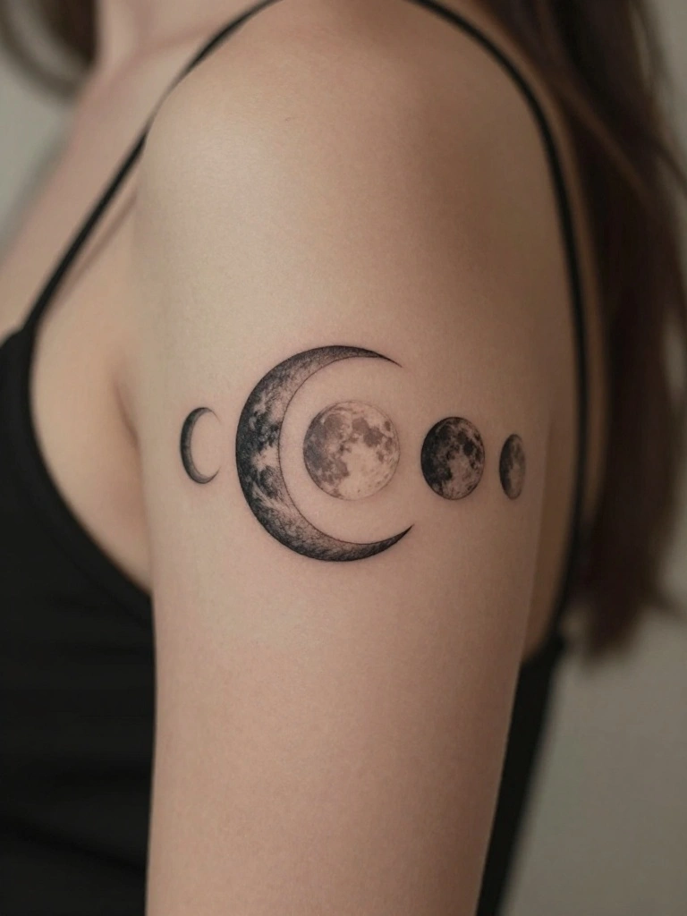 Moon phase tattoos capture the enchanting beauty of the lunar cycle, symbolizing change and intuition. This design typically features a series of small moons, each representing a different phase, making it visually stunning and meaningful. It’s perfect for those who have a strong connection to the cosmos. As you consider your moon phase tattoo, think about how intricate you want the design to be. Ideal placements include the forearm or wrist, where the tattoo can be admired. Pairing it with stars or floral elements can further enhance its beauty. When planning your moon phase tattoo, keep these points in mind: