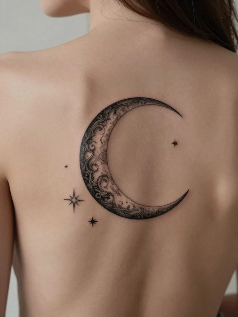 Placement on your back offers flexibility; you can arrange these designs in various ways, whether aligned or scattered. For a cohesive celestial theme, consider combining stars and moons. A minimalist approach with thin lines or dots can keep it subtle. You might also add gentle shading for depth without complicating the design.