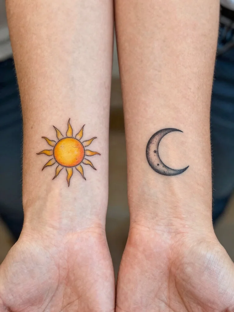 Consider customizing each design to represent your personal styles; perhaps one partner chooses a bold sun while the other opts for a softer moon. Placing them close together on matching body parts symbolizes your unique connection. This tattoo represents the idea of two souls coming together, celebrating the balance in your journey.