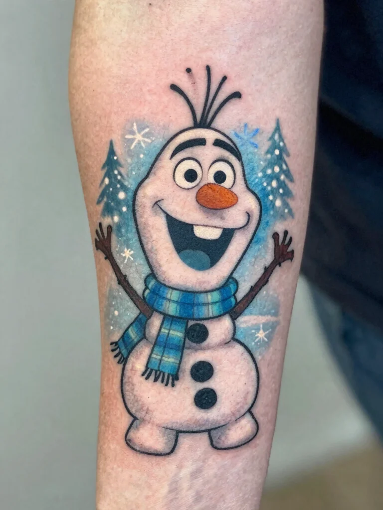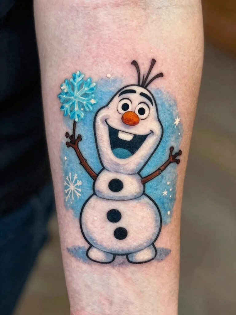 Olaf, the lovable snowman from Frozen, is a perfect tattoo choice for anyone who cherishes joy and friendship. A small Olaf holding a snowflake captures the essence of positivity and warmth, making it a whimsical design.