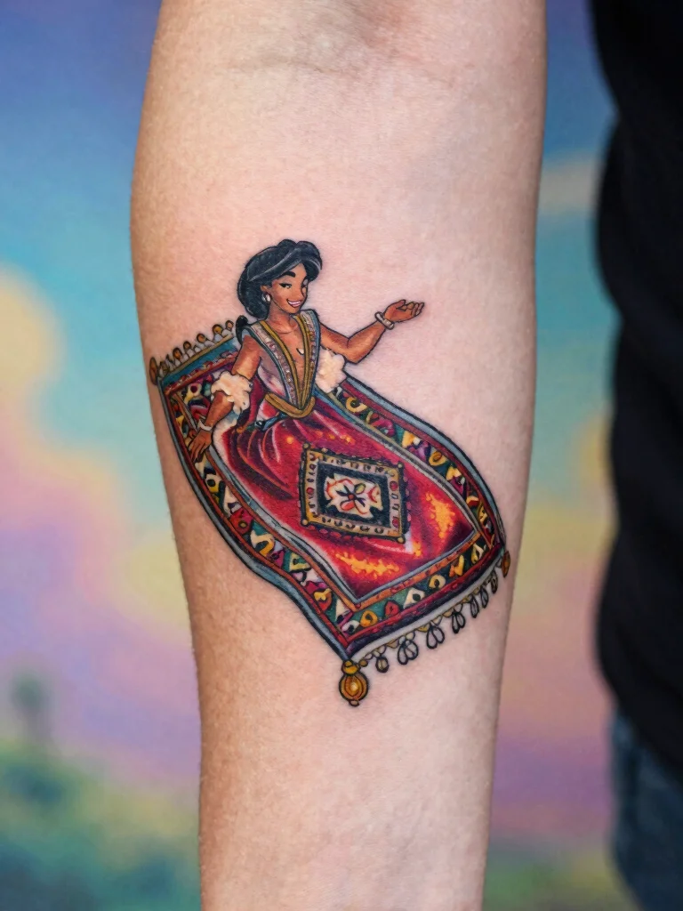 Aladdin’s magic carpet is a symbol of adventure and freedom, inviting thoughts of wanderlust and exploration. A small tattoo of this carpet resonates with those who dream of travel and discovery.