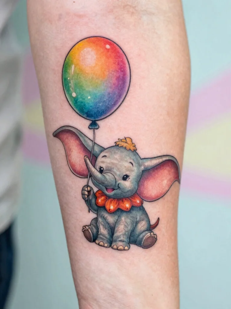 A tiny Dumbo holding a balloon is a delightful tattoo choice, capturing the magic of childhood dreams. This design symbolizes bravery and the joy of believing in yourself. Its bright colors can bring a cheerful vibe to your skin, reminding you to embrace positivity.