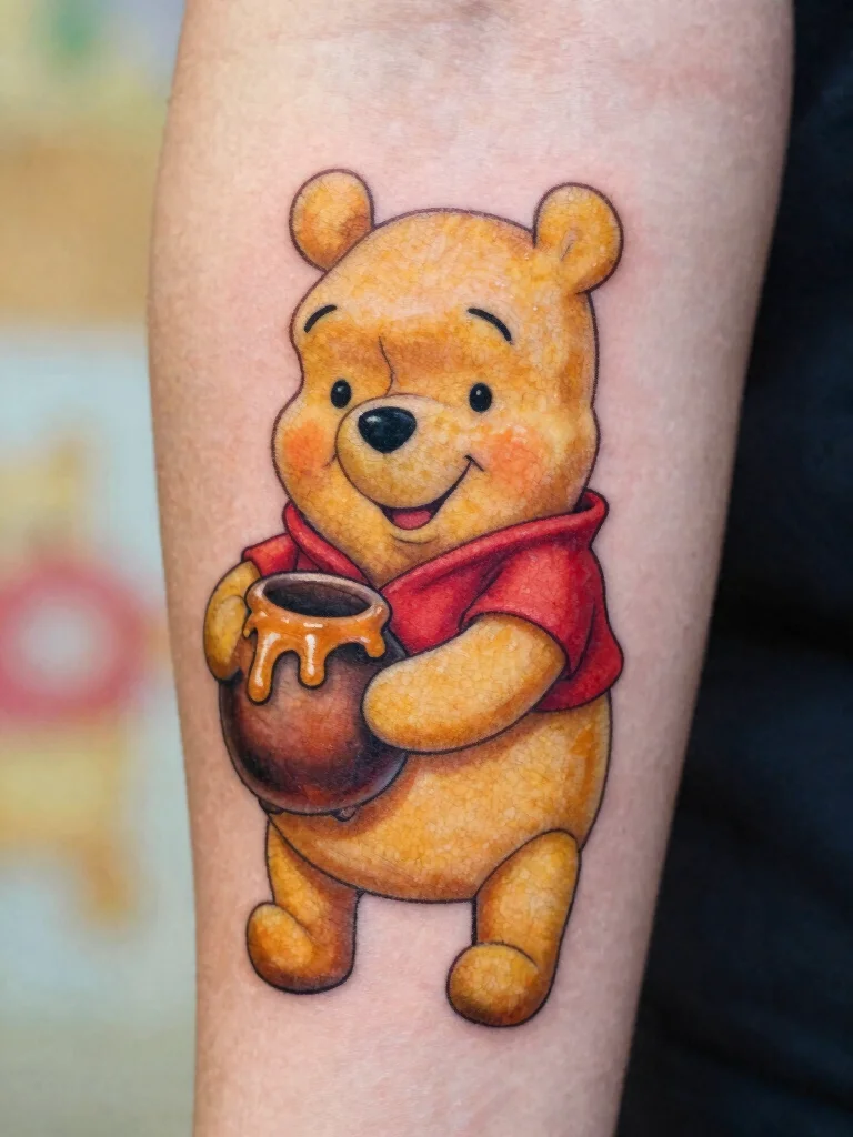 Ideal placements for this tattoo include the inner arm or shoulder, where it can be seen easily. You might also consider adding a sweet quote from Pooh, like ‘Oh, bother!’ to give it a personal touch.