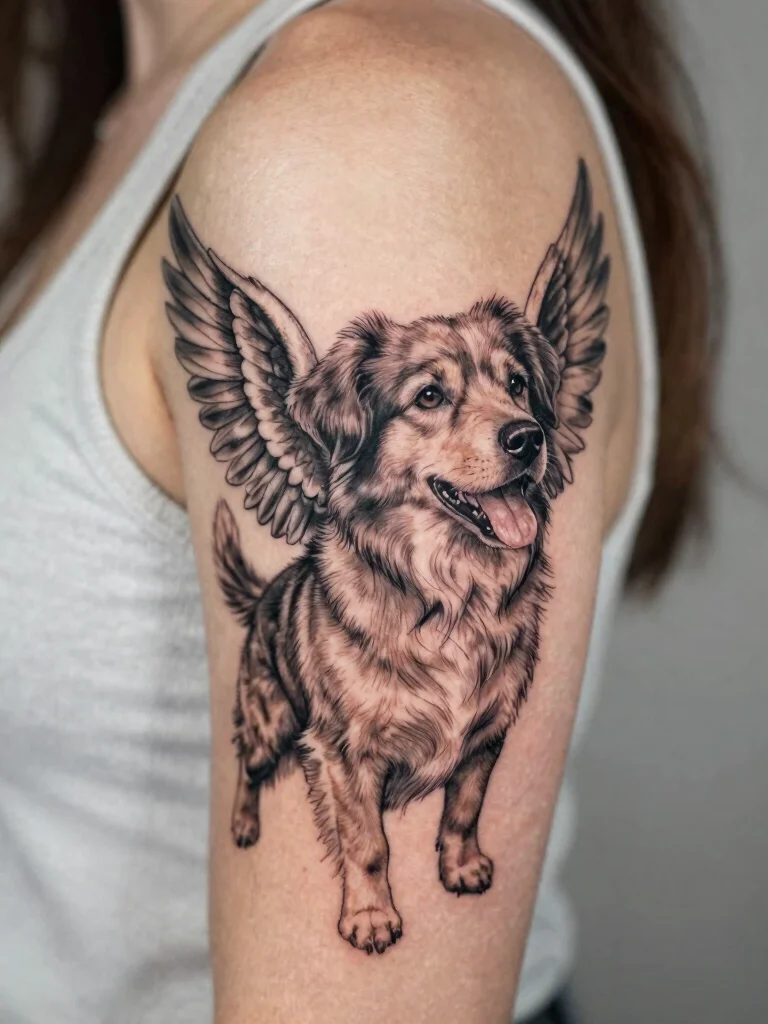 A tattoo of a dog with wings portrays your pet’s spirit soaring high above. This whimsical design serves as a touching reminder of the joy your dog brings to your life, symbolizing the bond that lasts beyond separation. You can customize this design to reflect your dog’s breed and personality, making it a special piece of art. Popular placements include the upper arm or shoulder for greater visibility.