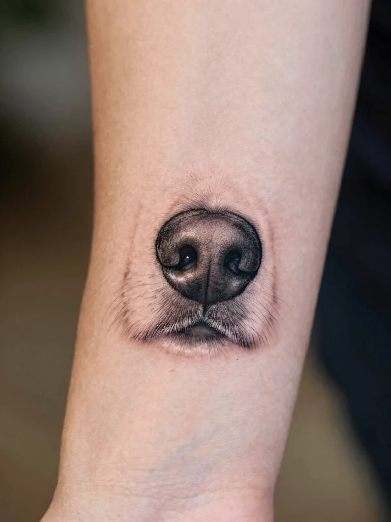A tattoo capturing your dog’s unique nose print is a deeply personal design. This tattoo embodies the essence of your furry friend, as every nose print is distinct. Its simplicity resonates with pet lovers who want to celebrate the special quirks of their dogs. Ideal placements for this tattoo include the wrist, shoulder, or inner bicep, creating a playful yet meaningful piece of art.