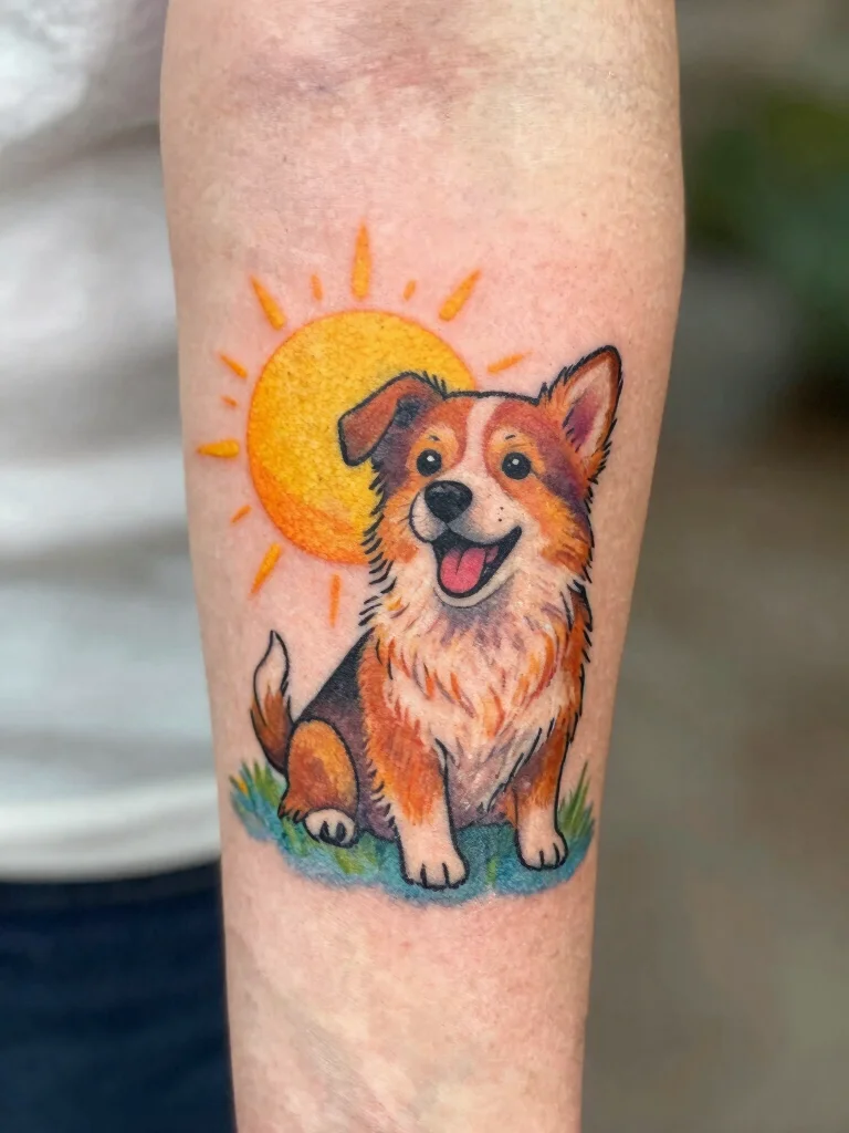 Small dog tattoos remind us that sunshine is a mood we wear. A playful pup beside a sun on your forearm can make every glance feel warm and bright. For a minimalist yet vibrant twist, pick bold sun colors to frame your furry muse.