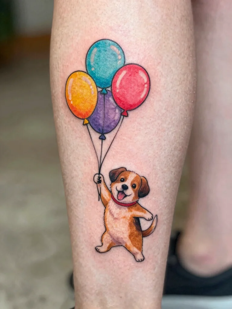 Consider varying the styles of the balloons to add flair to the design. This tattoo is a joyful reminder of the happiness pets bring into our lives.