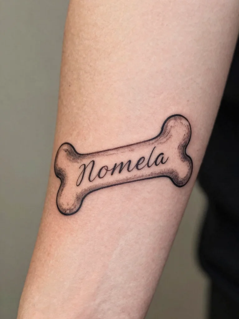 Celebrate your furry friend with a playful dog bone tattoo that features their name. This whimsical design combines a classic bone shape with your pet’s name written in a flowing script, adding a personal touch to the tattoo. It’s a fun way to showcase your love for your dog, especially when placed on visible spots like the forearm or thigh.