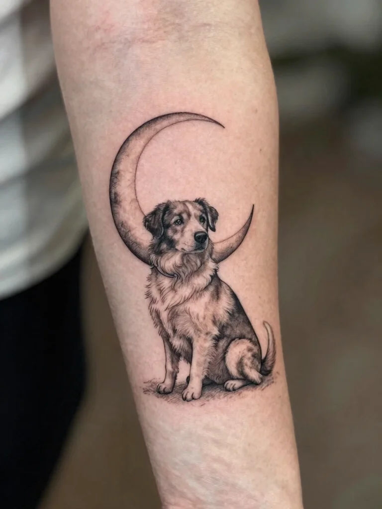 A tattoo of a dog beneath a crescent moon evokes feelings of tranquility and companionship. This whimsical design symbolizes the bond with your pet, suggesting their presence guides you even in dark times. Ideal placements for this tattoo are on the forearm or upper back, serving as a beautiful reminder of your dog’s love.