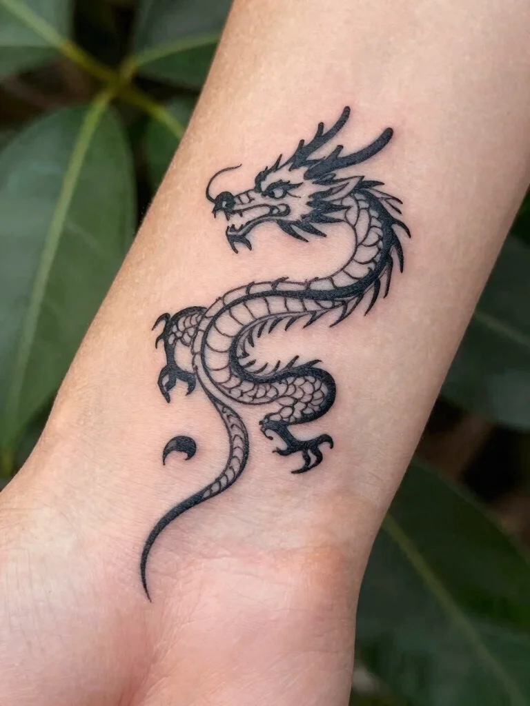 For a feminine yet subtle look, consider line art dragons, single-line silhouettes, tiny dragon shapes, or delicate wraps around the wrist or ankle. These are classic examples of minimalistic dragon designs that fit small dragon tattoos and still capture the fantasy body art vibe. If you like mythical tattoos, you can add tiny stars or clouds to keep it clean while nodding to myth. When choosing, think about scale, legibility at a small size, and whether you want solid black ink or soft shading to keep the design timeless.