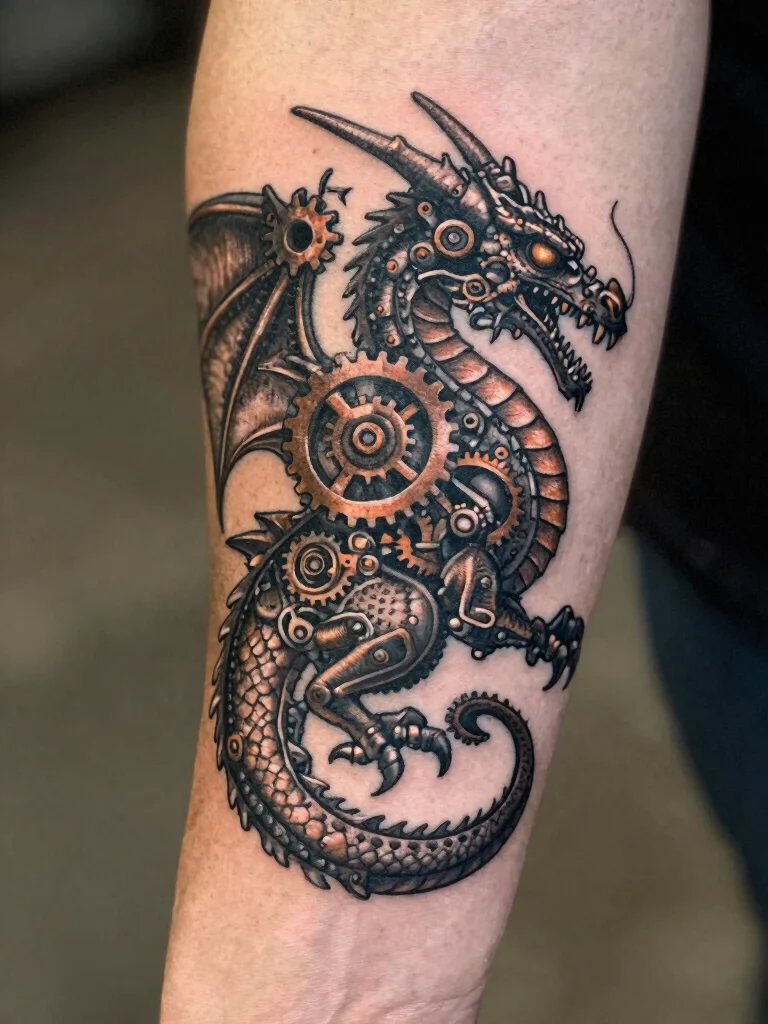 The steampunk dragon tattoo offers a unique blend of fantasy and industrial aesthetics. Featuring gears, cogs, and mechanical elements, this design showcases creativity and ingenuity. It’s perfect for those who are drawn to inventive themes and want their tattoo to stand out.