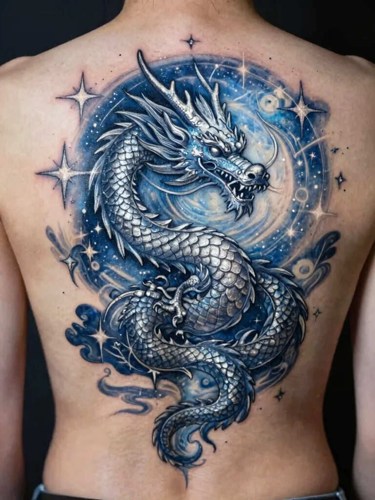 If you feel a connection to the cosmos, a celestial dragon tattoo combines magic and elegance. Featuring stars, planets, and celestial motifs intertwined with the dragon, this design symbolizes guidance and ambition. It’s ideal for anyone pursuing their dreams.