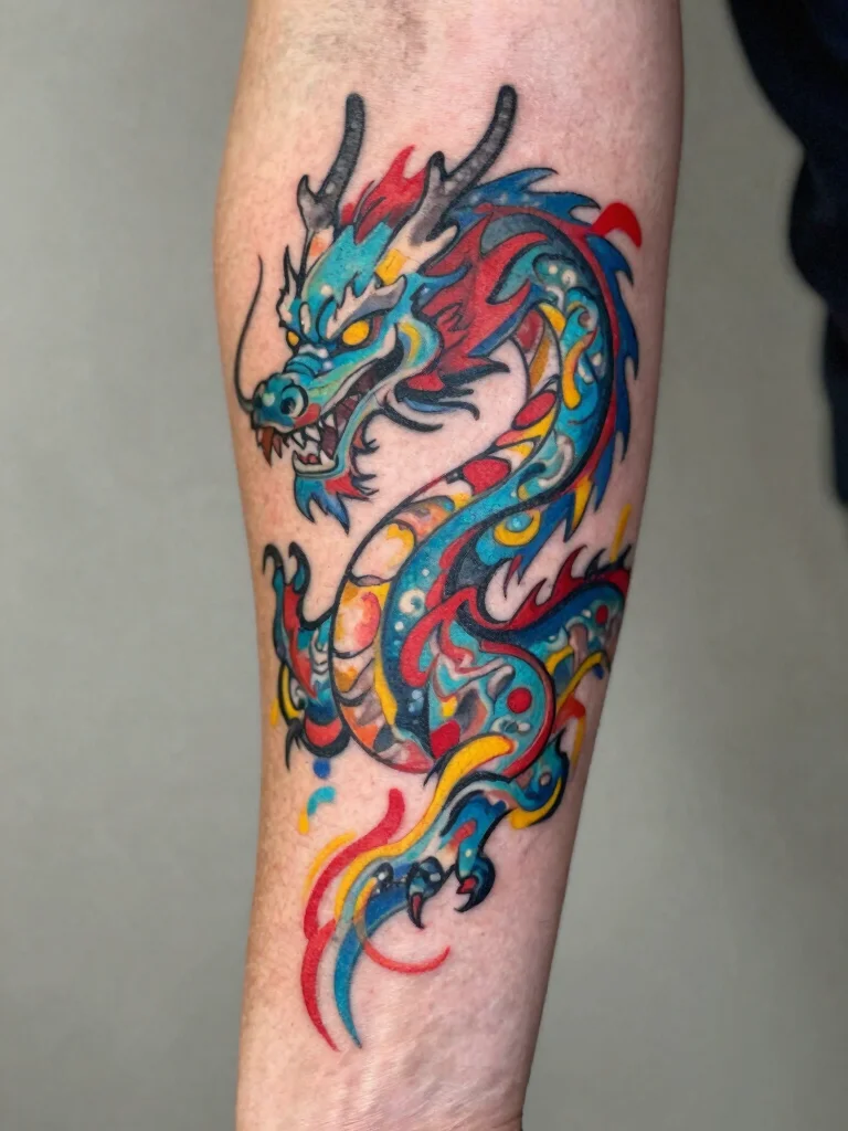 An abstract dragon tattoo pushes the boundaries of traditional design, offering a creative interpretation of the mythical creature. This style embraces freedom by using colors and shapes that suggest the essence of a dragon rather than depicting it realistically. It symbolizes creativity and breaking boundaries, perfect for those wanting to express their individuality.