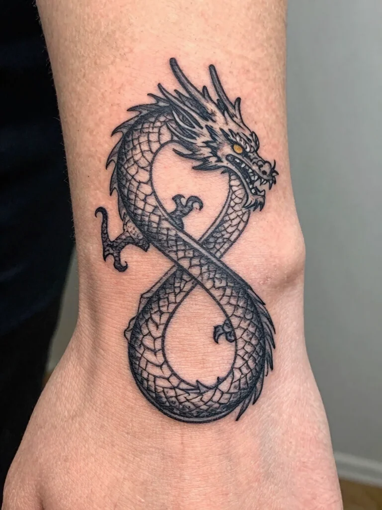 The infinity dragon tattoo beautifully merges the powerful imagery of a dragon with the concept of infinity. This design symbolizes endless strength and resilience, creating a flowing pattern that suggests movement. It’s ideal for those who wish to express their unbreakable spirit through art.