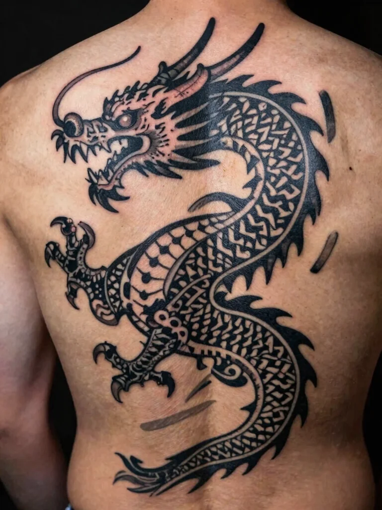 Geometric dragon tattoos combine traditional themes with modern design, making them a stunning option. This style features sharp angles and intricate patterns that symbolize strength and power, creating a visually compelling piece. It’s perfect for anyone wanting a unique tattoo that stands out.
