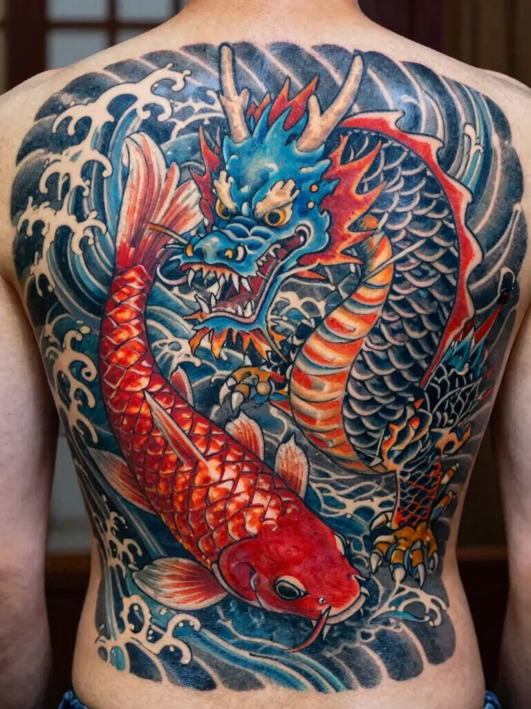 The Japanese koi dragon tattoo is rich in tradition and cultural significance, symbolizing perseverance and strength. This design showcases a dragon that has emerged from a koi, representing transformation and overcoming challenges. It’s perfect for those who appreciate deeper meanings in their body art.