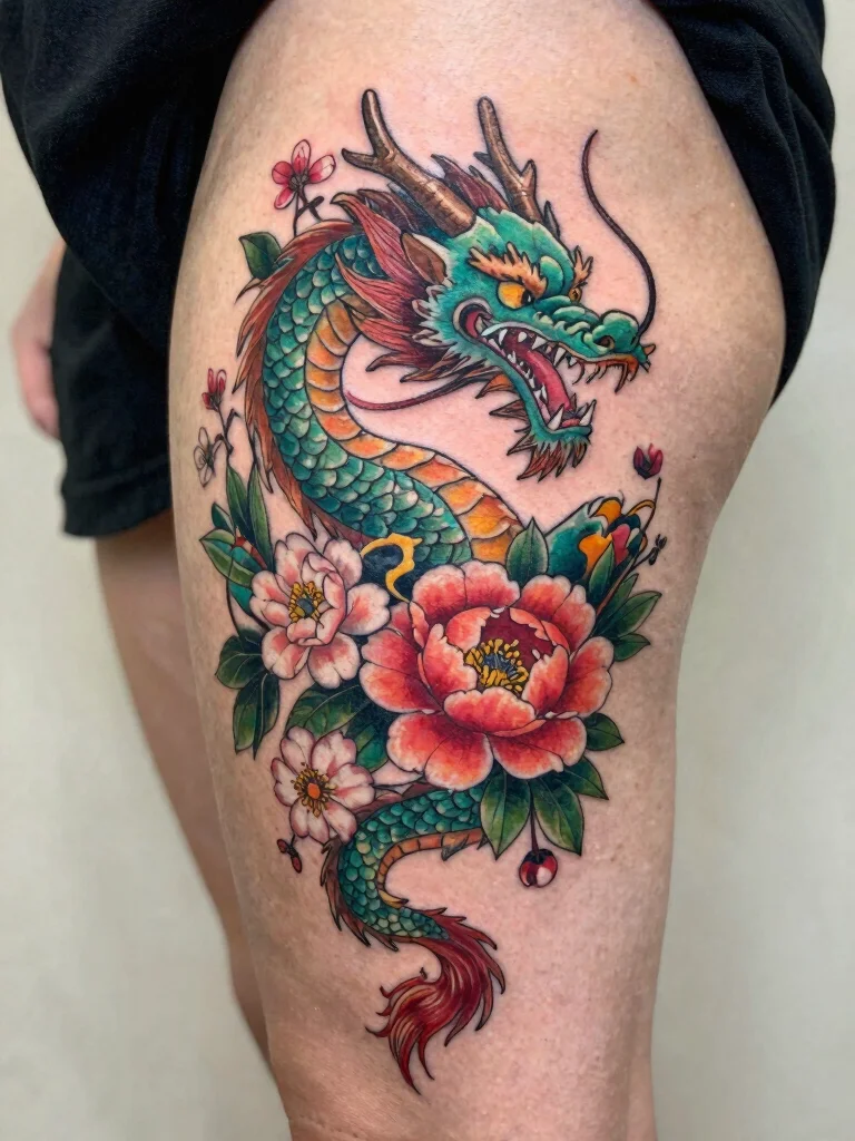 Ideal placements include the thigh, side, or back, allowing for a larger floral design without overshadowing the dragon.