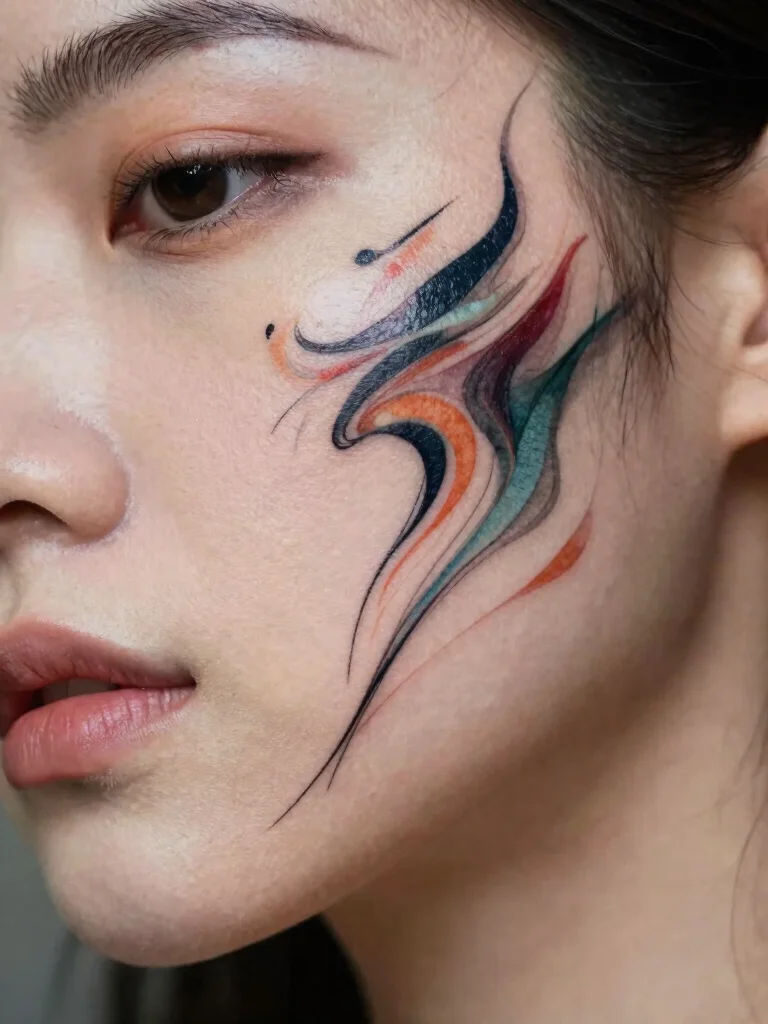 A splash of ink on your cheek or a freeform swirl near your eye makes a bold statement while keeping a minimalist vibe.