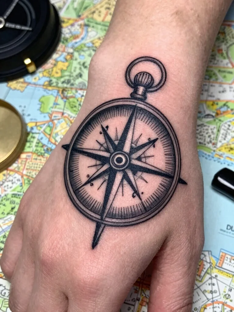 A compass tattoo symbolizes direction and adventure, embodying the journey of self-discovery. For many, it serves as a reminder to stay true to one’s path while navigating life’s challenges. A small compass tattoo on the finger acts as a guide, encouraging confidence in your choices.