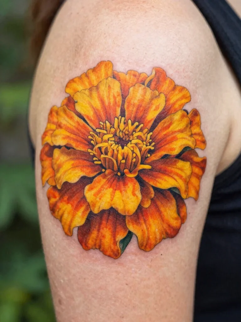 The mystical marigold tattoo stands out with its cheerful symbolism and lively colors, capturing a love for life and creativity.
