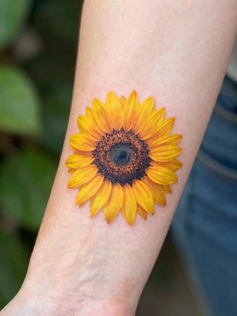When designing your sunflower tattoo, think about its symbolic meaning of warmth and joy. You could choose a classic yellow design or opt for a minimalist black outline for a modern twist. Placing it in a visible area allows it to brighten your day and those around you.