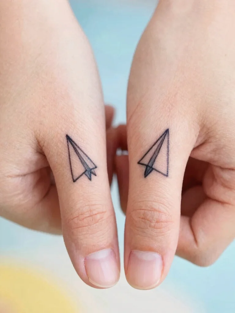 Paper airplanes offer a playful and whimsical tattoo choice that represents freedom and adventure. Matching tiny paper airplane tattoos symbolize your readiness to embark on life’s journey together. These designs are often simple lines, enhancing their minimalist appeal.