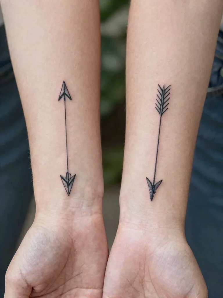 Minimalist arrow tattoos beautifully illustrate your journey as partners, aiming for the stars together.