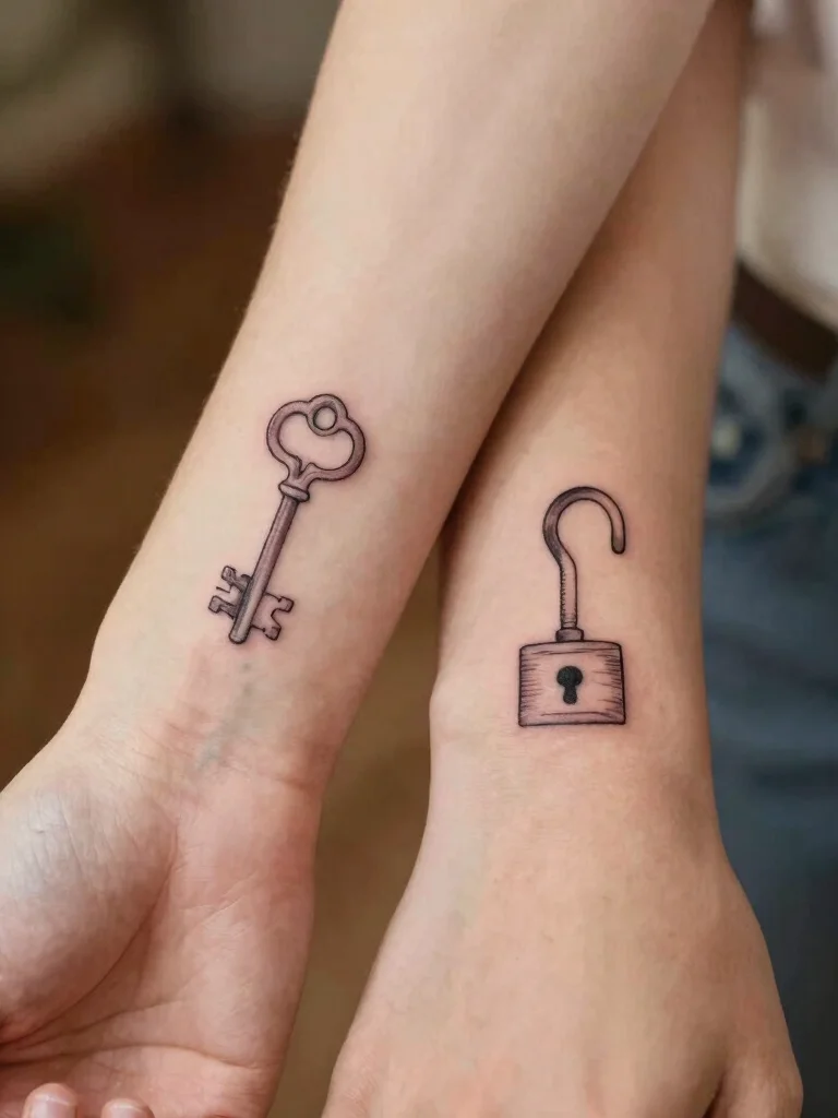 These minimalist designs are chic yet meaningful, perfect for inking on your wrists, arms, or even the back of your neck. This playful concept conveys that you both hold the key to each other’s hearts.