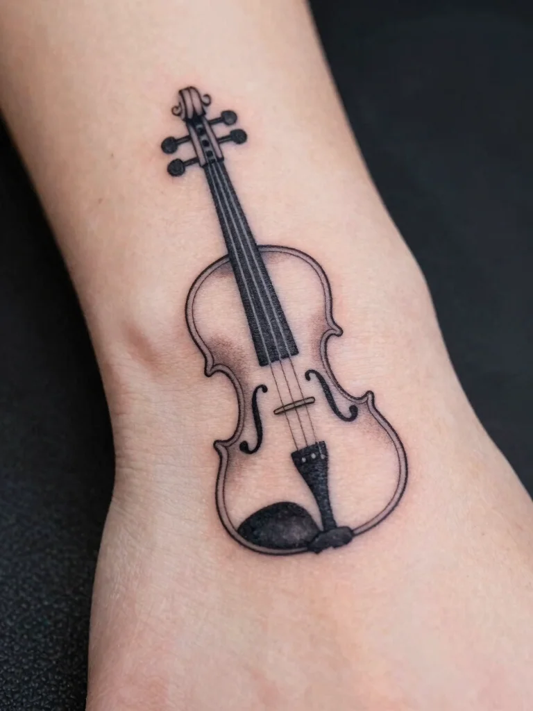 A minimalist tattoo of the F-holes of a violin is a sophisticated choice for string players. This elegant design emphasizes the beauty of one of music’s most classical instruments. Placed on the wrist or upper back, it symbolizes the emotional depth of music.