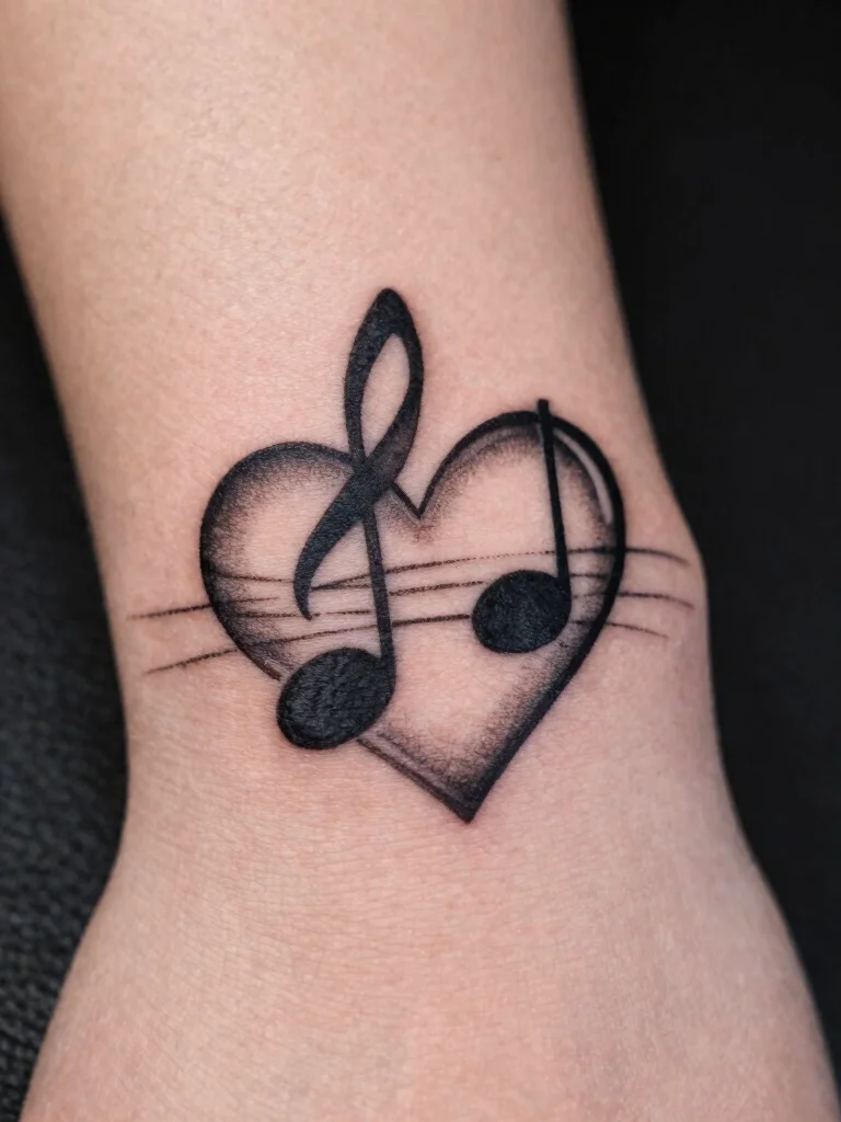 Combining a music note with a heart creates a cute and meaningful tattoo that embodies your love for music. This design reflects the idea that music comes from the heart, resonating with both musicians and fans. Ideal placements include the wrist, collarbone, or ankle, making a statement without being overwhelming.