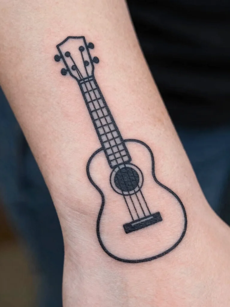 The clean lines keep it simple yet meaningful, capturing the essence of the guitar without overwhelming your style. Keep the size small and opt for classic black or earthy tones to create a unique twist that reflects your love for music.