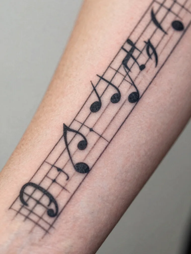 A tattoo featuring a musical staff with notes is a striking way to express your passion for music. This design captures the essence of melodies and can be customized with specific notes from your favorite songs. Placing it on your forearm or the back of your neck adds elegance and a touch of movement to your body art.