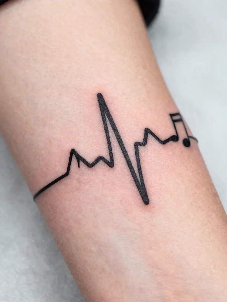 A tattoo that combines a heartbeat line with musical notes beautifully symbolizes the rhythm and pulse that music brings to life. This design is perfect for anyone who feels music coursing through their veins. Ideal for placement on the wrist, forearm, or chest, its unique design tells a heartfelt story.