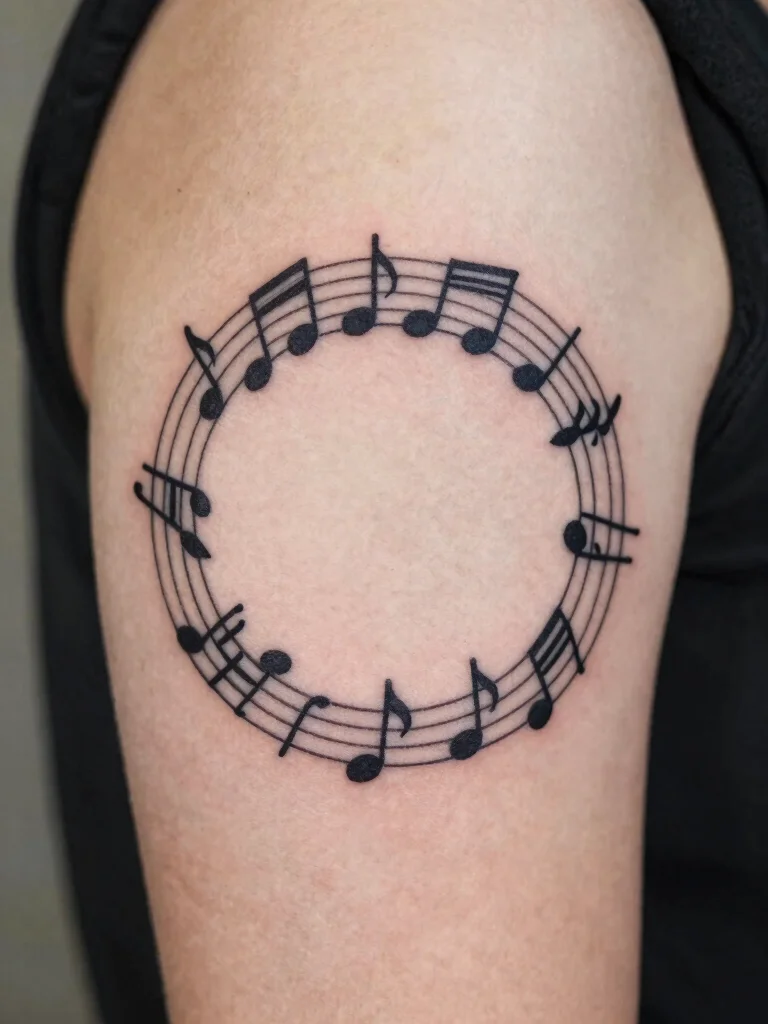 A circular design made of music notes is a unique and artistic way to express your love for music. This tattoo symbolizes the unity of different notes coming together to create harmony. Perfect for placement on the arm or behind the ear, its eye-catching yet gentle design captures the essence of music beautifully.