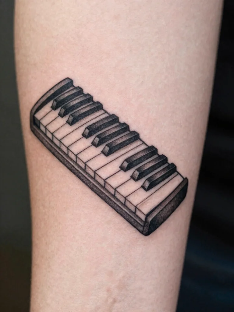 A small tattoo of piano keys is a beautiful representation of musical passion, especially for pianists. This design can be depicted simply as a line of keys or creatively arranged across your skin. Ideal for placement on the forearm or back of the neck, it symbolizes a love for rhythm and melody.