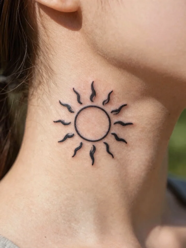 A small sun tattoo symbolizes vitality and positivity, representing growth and energy. This design can range from simple outlines to intricate depictions with rays spreading outward. Its placement on the neck can radiate warmth and brightness, adding a cheerful touch to your look.