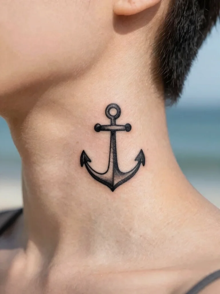 A tiny anchor tattoo symbolizes stability and strength, making it an excellent choice for a small neck tattoo. This design can be a simple outline or a more detailed depiction, resonating with those who value loyalty and grounding forces in their lives.