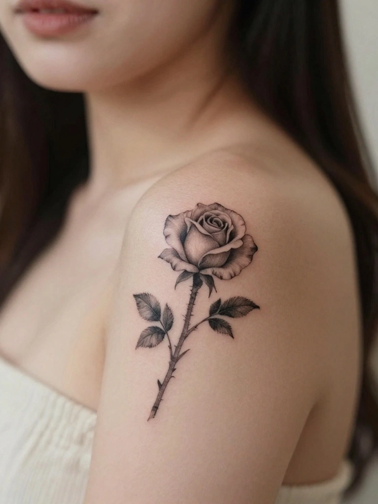 To start, think about the size and placement that best suits your body. The shoulder offers a lovely curve, making it the perfect spot for this elegant design. A tiny rosebud not only adds beauty but also carries deep meaning, reflecting your appreciation for floral themes.