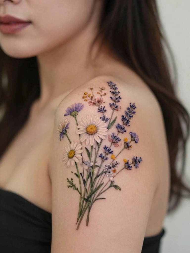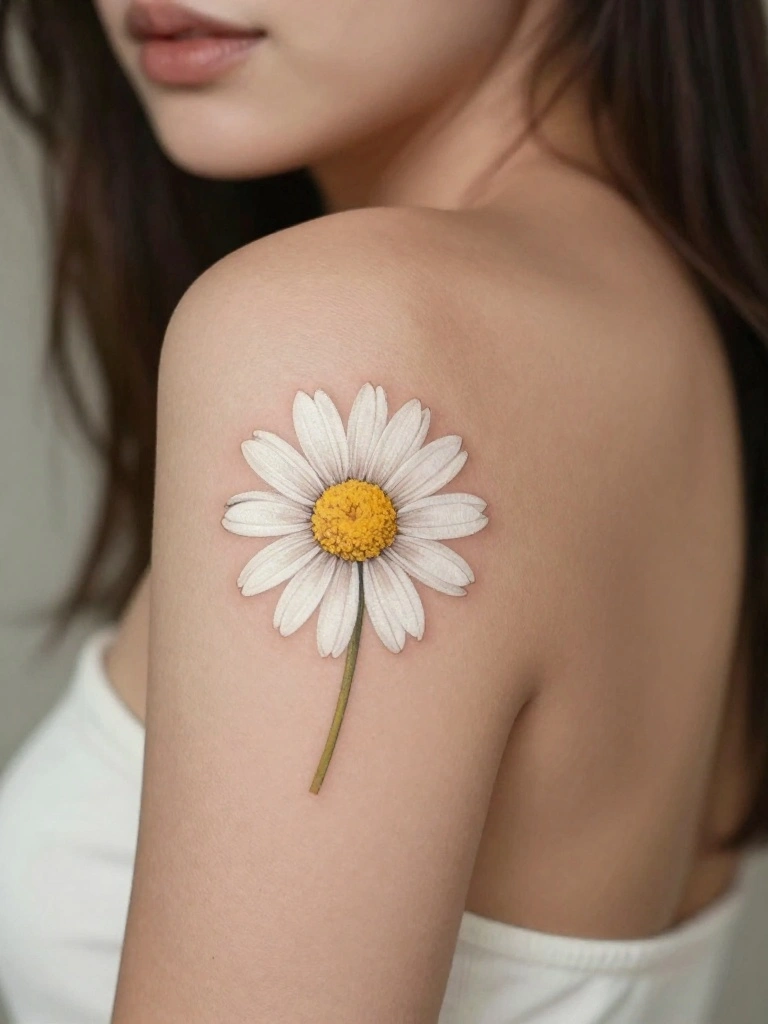 A daisy tattoo on your shoulder will bloom beautifully, enhancing your unique charm.