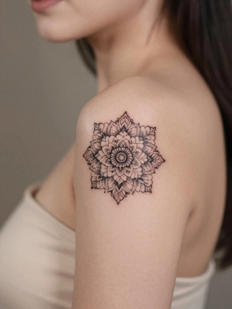 A floral mandala tattoo on your shoulder will beautifully express your journey toward harmony and self-discovery.